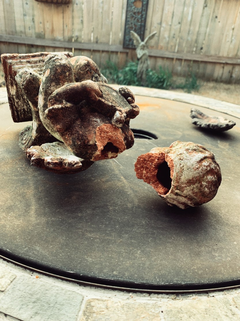 I just came outside to enjoy the nice afternoon and she wasn’t on the table. The wind had blown the rug up and knocked her off. There she was on the patio….broken…completely broken. Now, she’s not just a sweet little one winged angel reminding me it’s ok to be a little broken. She’s unfixable.